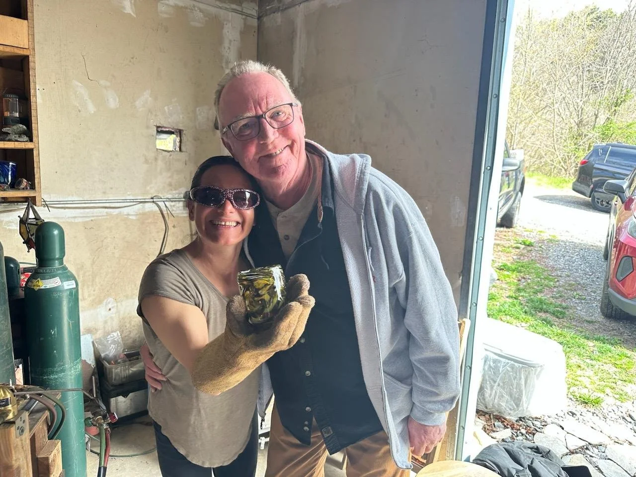 Posing with a student and her drinking glass before I put it in the kiln for annealing
